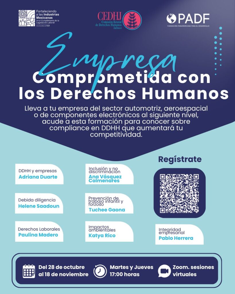 Con el propósito de fortalecer el compromiso del sector privado con la sostenibilidad y el cumplimiento normativo la Fundación Panamericana para el Desarrollo (PADF) y la Comisión Estatal de Derechos Humanos Jalisco (CEDHJ) invitan a las empresas de los sectores automotriz, aeroespacial y de componentes electrónicos a participar en la formación gratuita “Empresa comprometida con los Derechos Humanos”.