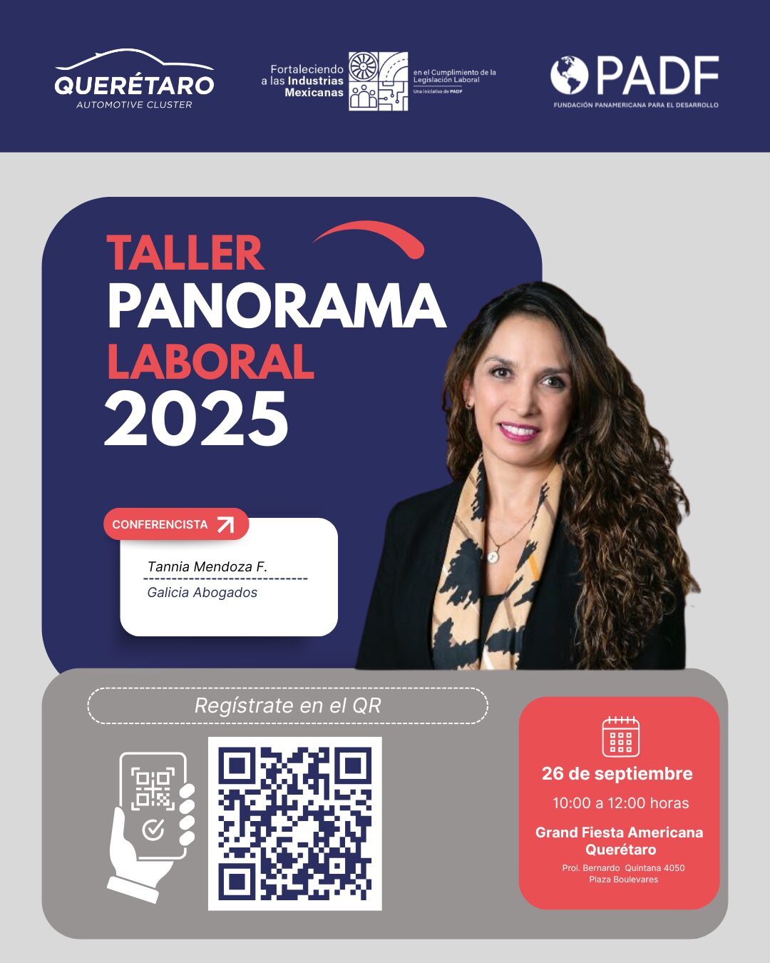 En el Taller Panorama Laboral 2025, organizada junto al Clúster Automotriz de Querétaro, contaremos con la participación de Tannia Mendoza F. (Galicia Abogados), quien compartirá los principales retos y oportunidades que marcarán el rumbo del ámbito laboral.